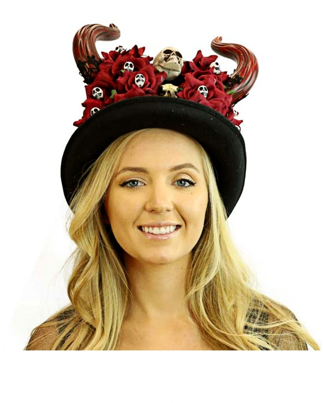 Trage den Dia De Los Muertos Zylinder mit Hörner am Day of the Dead und mach deinen Kopf zum Blickfang. Der Day of the Dead Zylinder ist schwarz. Er ist mit einer Vielzahl an blutroten Blüten und ebenso vielen kahlen Totenköpfen verziert. Prunkstück aber sind die beiden gebogenen Hörner, die aus dem Zylinder wachsen.