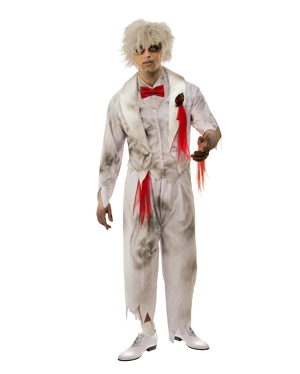 Das Geister Bräutigam Kostüm für Herren ist eine geniale Halloween Verkleidung, die dir viel Aufmerksamkeit bescheren wird. Der schicke weiße Hochzeitsanzug ist sicher einmal sehr edel gewesen. Der Frack mit Weste und das Fake-Hemd mit Fliege zeugen von einem ganz besonderen Modell. Doch leider hat das Massaker am Hochzeitstag Schmutz und sehr viel Blut auf dem schönen Anzug hinterlassen. Zudem ist deine Hose zerrissen. Passend zu deinem blutigen Gespenster Kostüm kannst Du auch das stilechte Blut Gel / Blood Gel 240ml kaufen und dein Gesicht damit verzieren. Dann sieht es echter aus.