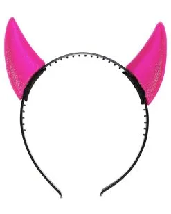 Die pinken Glitzerhörner sind an einem Haarreif befestigt, den sich jede angehende Teufelin mit etwas Haar auf dem Kopf aufsetzen kann. Der Haarreif selbst ist schwarz. Die Hörnchen ergeben zusammen mit dem Sexy Catsuit Pink und einem Paar Fingerlose Netzhandschuhe Neonpink ein tolles Junggesellinnen-Kostüm.