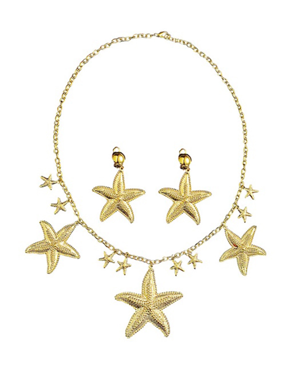 Verwandle dich in eine süße Meernixe und trage bei deinen Unterwasser-Abenteuern unser Goldenes Mermaid Schmuck Set als Kostümzubehör. Goldene Seestern Ohrringe und die dazu gehörende Kette mit Seesternen macht deine Mermaid Verkleidung komplett! Noch mehr Kostümschmuck für Meerjungfrauen findest du in unserem Onlineshop!