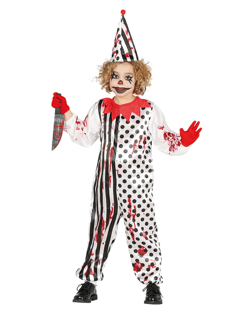 Das Horror-Clown Kinderkostüm besteht aus einem Clownhut und einem Jumpsuit. Es ist in den Größen S, M, L erhältlich und besteht aus sehr weichem, hautfreundlichem Material. Der Jumpsuit sowie der Hut sind weiß, mit schwarzen Streifen und Punkten verziert. Ein roter Clownkragen rundet das Outfit ab. Als besonders gruseligen Effekt hat das Horror-Clown Kinderkostüm überall kleine Blutspritzer die es noch bedrohlicher machen. Wenn du mit deinem Nachwuchs als mörderisches Gespann für Unruhe sorgen willst, dann empfehlen wir dir das furchteinflößende Horror Zirkus Clown Kostüm mit Maske
