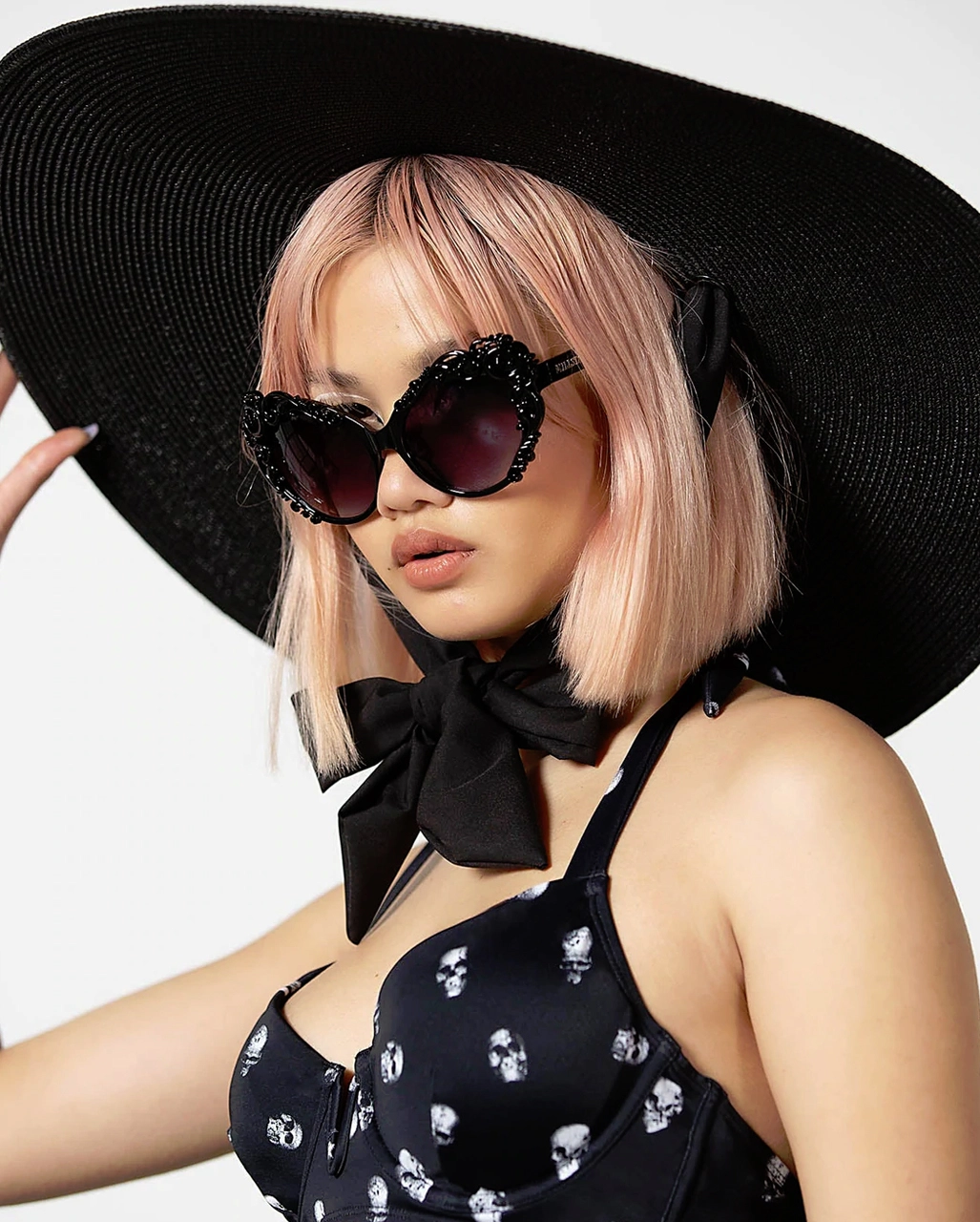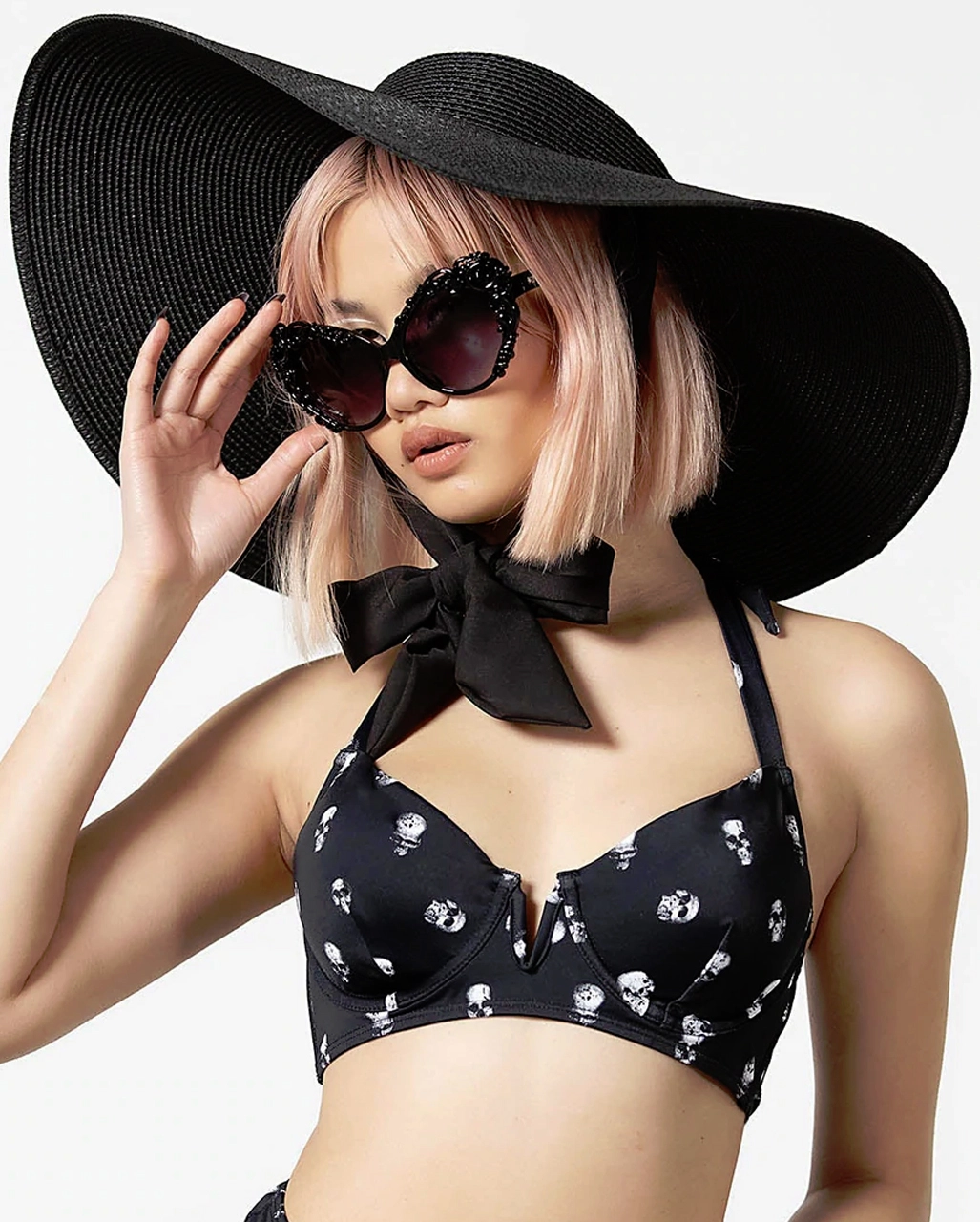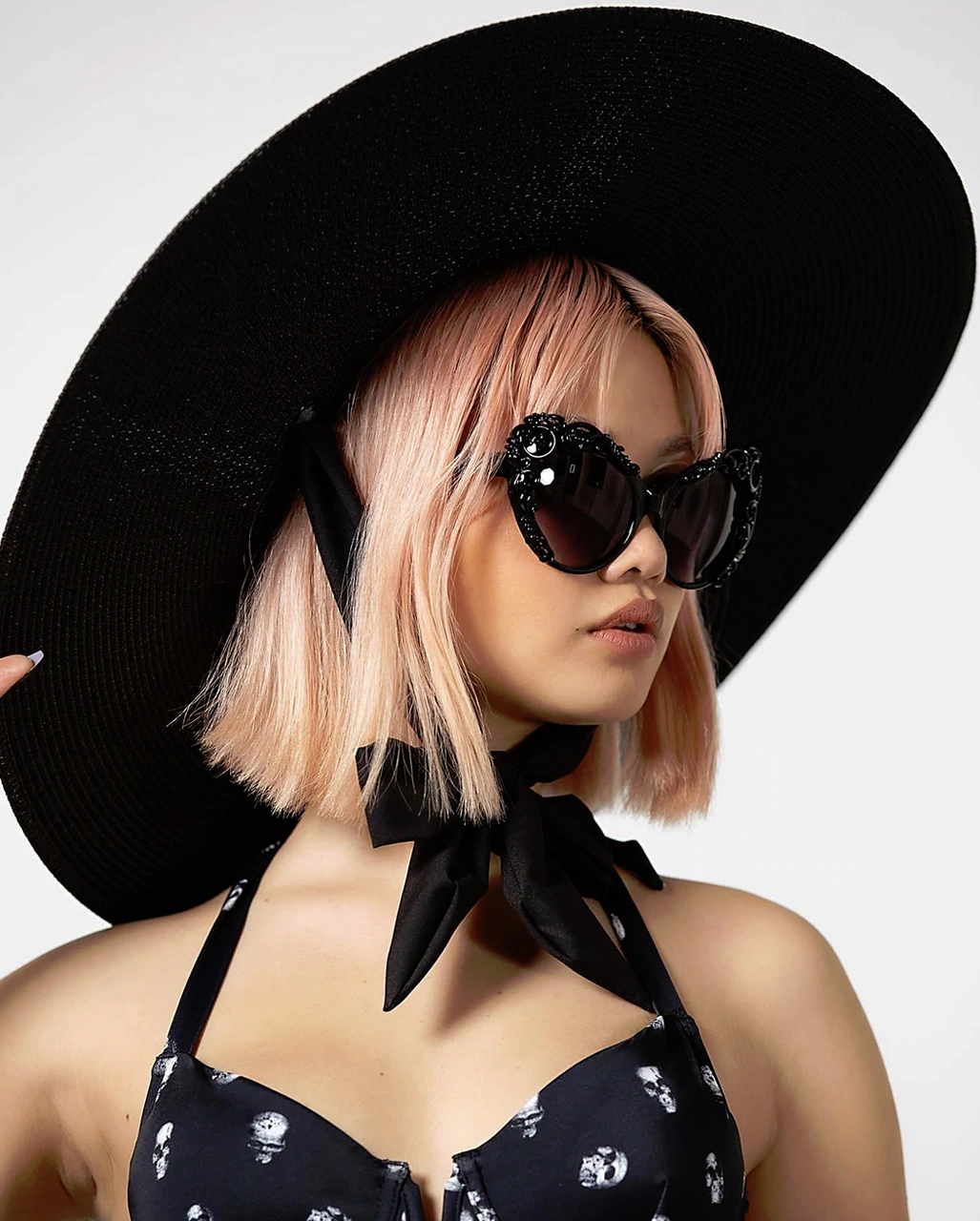 Sonne, Spaß & Strand! Für eine Gothic Lady stellt der Sommer eine echte Herausforderung dar. Schließlich soll nichts und niemand deine noble Blässe stehlen. Dafür hast du ja auch viel zu lange in deiner düstreren Gruft ausgeharrt. Um deinen aufregend-bleichen Teint zu bewahren, ist unser KILLSTAR Beyond the Veil Sonnenhut die perfekte Lösung. Der schwarze Gothic Strohhut kommt mit breiter Krempe und einem romantischen Chiffon-Band zum Zubinden – Da sind begehrende Blicke vorprogrammiert!