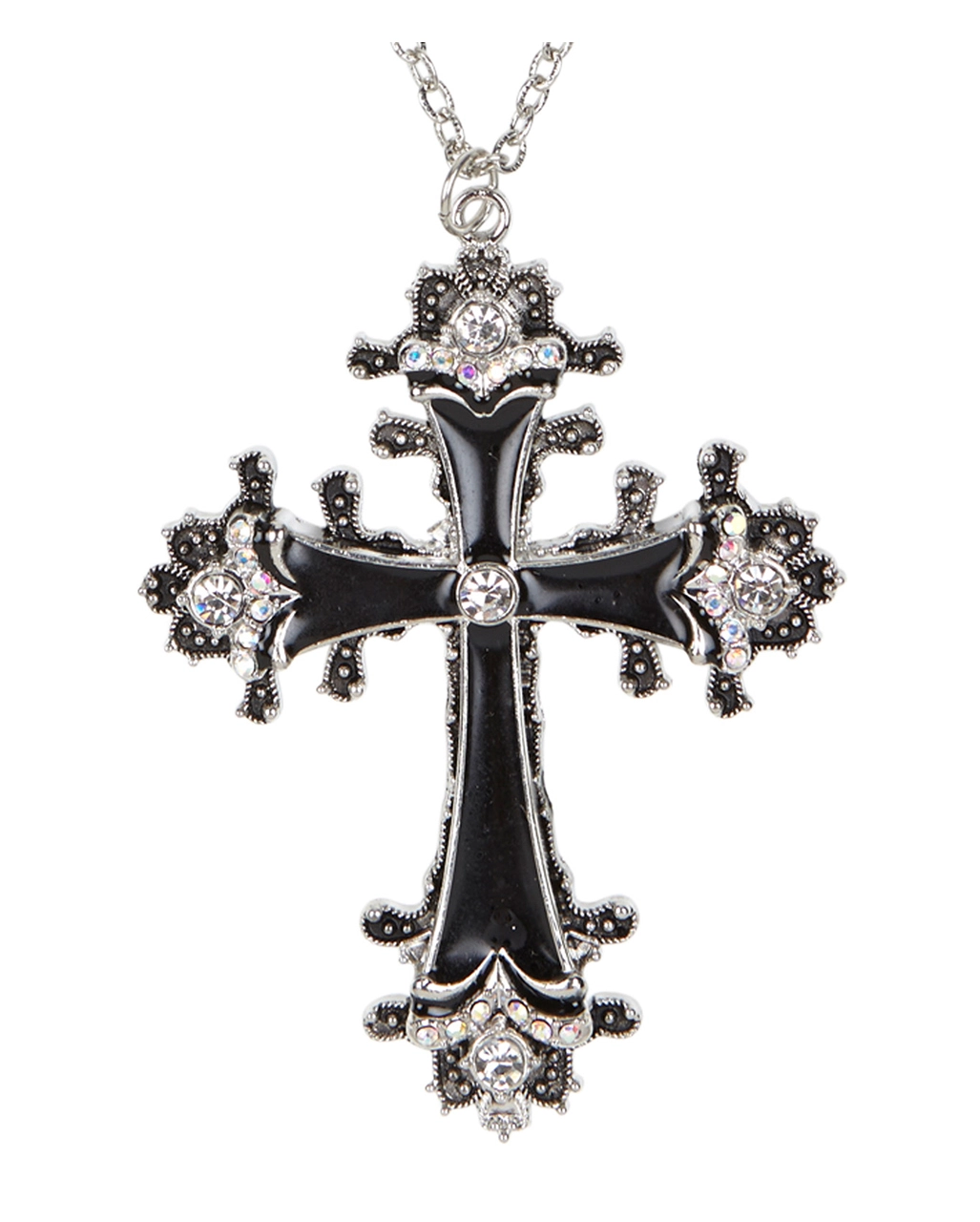 Die Kostümkette mit Kreuzanhänger & Strass Steinen besteht aus Metall und Acryl und hat eine hochwertige Optik. Die Gothic Kette mit Kreuz-Anhänger lässt sich vielseitig kombinieren, erzielt aber auch allein getragen seine Wirkung. Die Gothic Ohrringe Kreuz passt hier ideal dazu.
