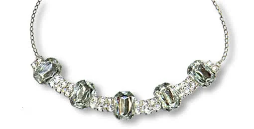 Das Schmuckcollier besteht aus fünf grossen, silberfarbenen Schmucksteinen sowie kleineren Straßsteinchen, die als bewegliche Gliederkette dienen. Die Metallkette kann beliebig an den einzelnen Gliedern eingehackt werden und ist somit grössenverstellbar. Das Kostüm Accessoire lässt sich super zu Marilyn Monroe Outfits wie z. B. dem Marilyn Showgirl Kostüm oder dem Marilyn Kostüm M/L kombinieren.