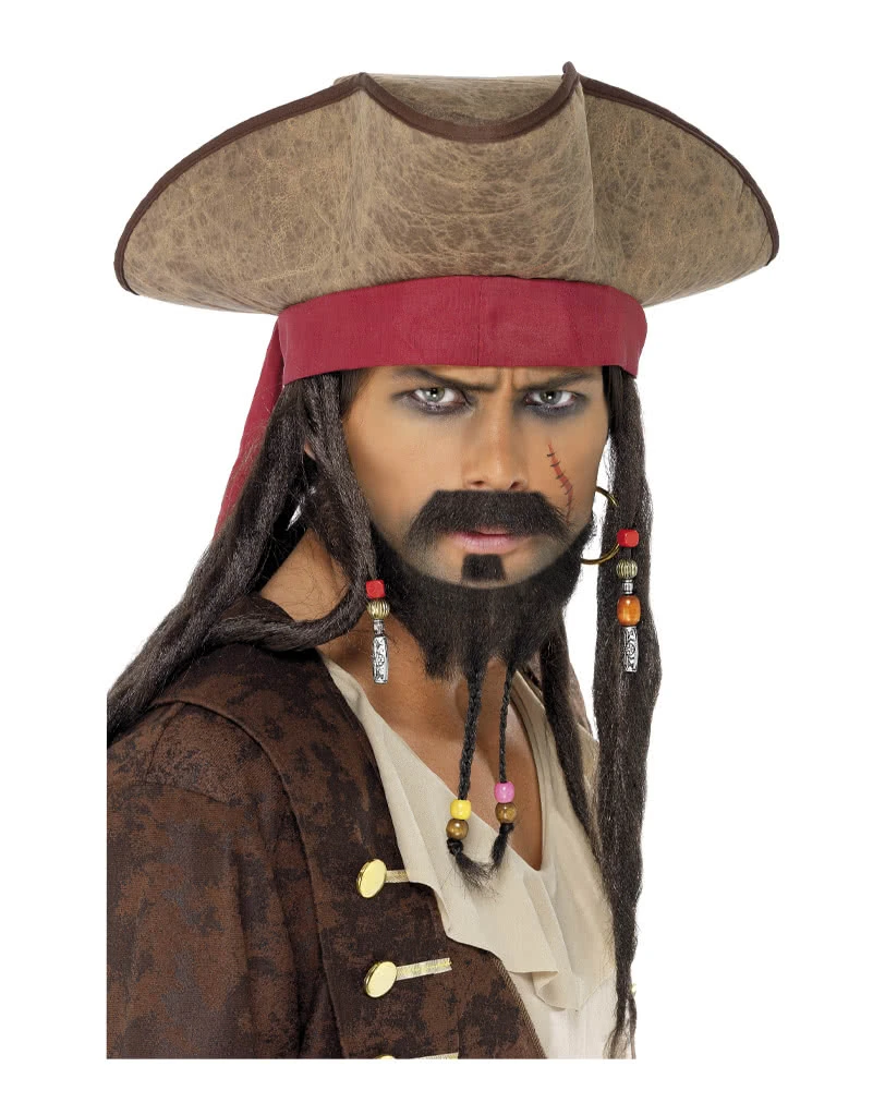 Der braune Piratenhut mit Dreadlock-Haaren hat die klassische dreieckige Form und ein rotes Bandana. Die langen schwarzen Haare und Dreadlocks sind direkt an dem Hut festgenäht und werden noch von zwei rot-orangen Perlenzöpfe aus Holzperlen und silbernen Schmuckperlen geschmückt. Deinen Look als Piratenkapitän rundest du mit dem Piraten Bart Set ab.