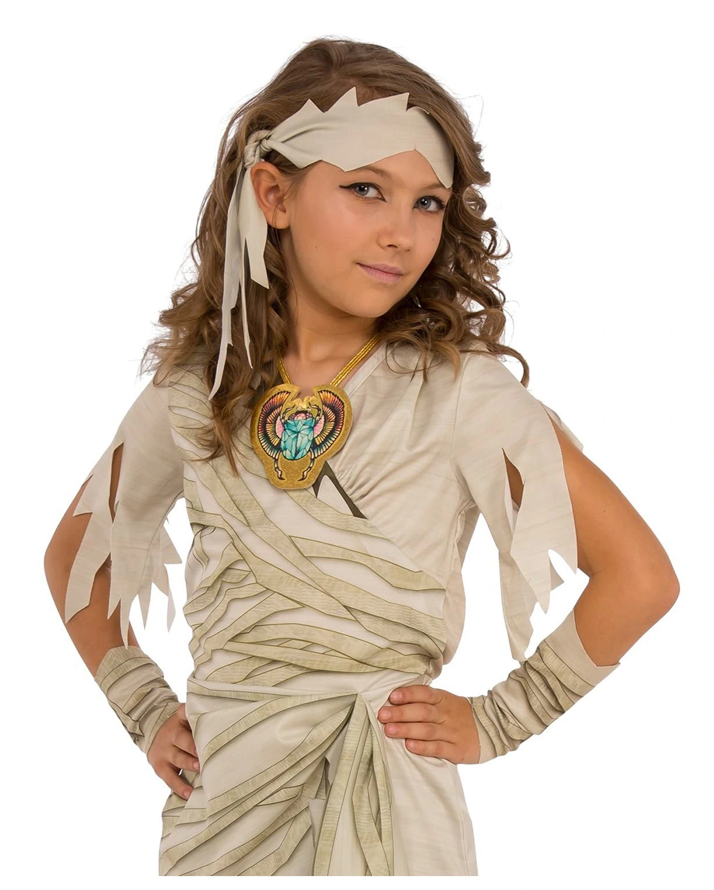Erschrecke deine Eltern mit dem Prinzessin der Untoten Mumien Kinderkostüm. Das Oberteil und die Hose sehen aus, als würden sie aus beigefarbenen Mumienwickeln bestehen. Ganz stilecht trägst du auch die Armstulpen im Wickel-Stil. Das Kopfband komplettiert den untoten Wickel-Look des Halloween Kinder Kostüms. Die wertvoll aussehende Kette allein zeugt davon, dass du eine echte ägyptische Prinzessin gewesen bist.