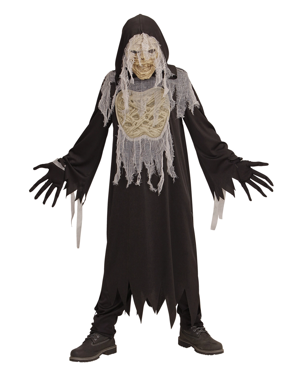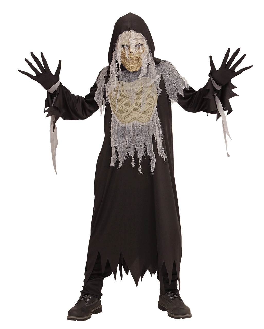 Das schrecklicher Mumiengeist Kinderkostüm macht seinem Namen alle Ehre. So ein Halloween Mumien Kostüm ist nämlich ziemlich schrecklich anzusehen. Die Robe der Halloween Verkleidung für Kinder hängt in Fetzen, was dafür spricht, dass du einige Jahre im Grab gelegen hast. Die Handschuhe, die zu dem Geister Kinder Kostüm gehören, lassen deine Finger lang und spitz aussehen. Highlight des gruseligen Trick or Treat Verkleidung ist die Maske, die ein schauderhaftes Mumiengesicht zeigt.