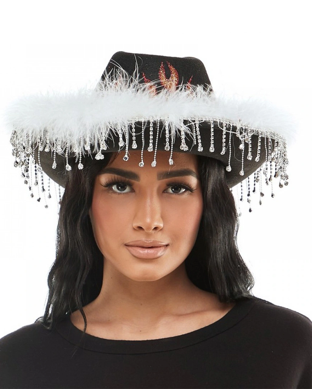 Extravaganter Hut mit Fransen und glitzerndem Flammen Motiv