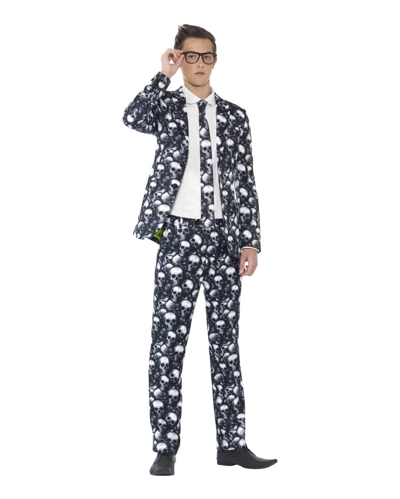 Normalerweise haben Anzüge immer etwas Spießiges. Dieser nicht. Der ist cool. Da sind Totenköpfe drauf. Und für das Vampir Kostüm von letztem Jahr bist du mittlerweile zu alt. Oder?
