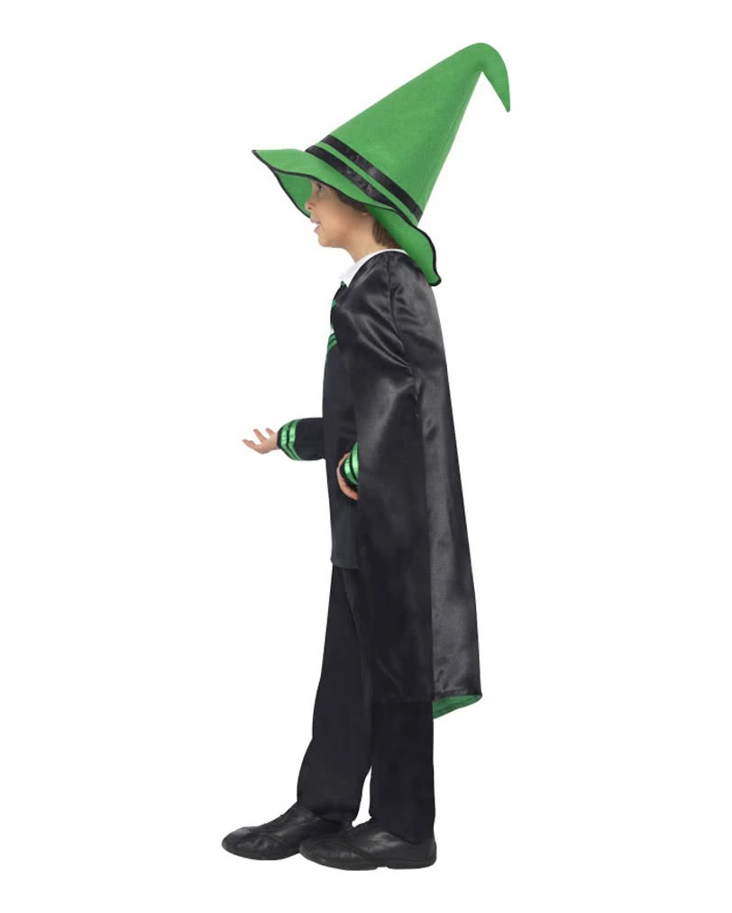 Zum Zauberlehrling Kinderkostüm gehören ein schwarzer Pullover mit weißem Kragen und einem kleinen Aufdruck auf der Brust. Dazu kommen noch ein Umhang, der außen aus schwarzen und innen aus grünem Stoff besteht. Der obligatorische Zaubererhut ist grün mit einer schwarz geränderten Krempe und er weist zwei schmale, ebenfalls schwarzfarbige Stoffbänder um die Hutmitte auf. Damit es deiner Zaubershow nicht an Effekten mangelt, haben wir den Zauberstab mit Licht und Sound und im Notizbuch Pentagramm lassen sich geheime Tricks und Kniffe niederschreiben.