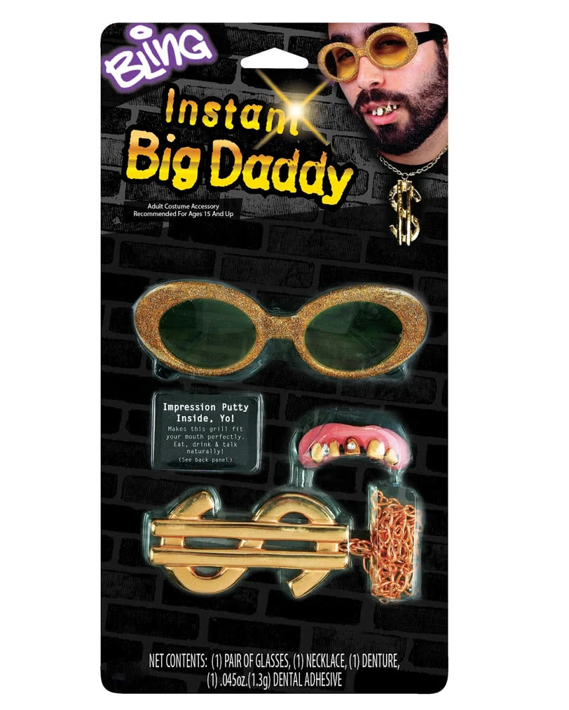 Dieses Ludenset beinhaltet eine prollige goldene glitzer Brille mit gelben Gläsern, schiefe Zähne mit einem diamantbesetzen Goldzahn plus der Klebemasse zum Anpassen. Den krönenden Abschluss des Zuhälter Instant Sets bildet die dazugehörige Kette einem großen goldenen Dollarsymbol. Die praktischen Instant Sets sind auch als Teufel Instant Set und Social Nerd Set erhältlich.